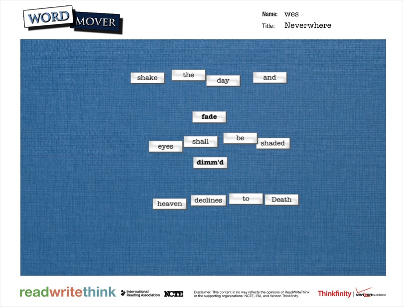 I didn't do much of a poem; some of my other works were longer. You can see the word bank is on the bottom, pops up and down into the work space. There are different background options as well. The words can be resized (I made them large since I was only using 2), rotated, and colored. The fonts can also be switched. Lots of options.